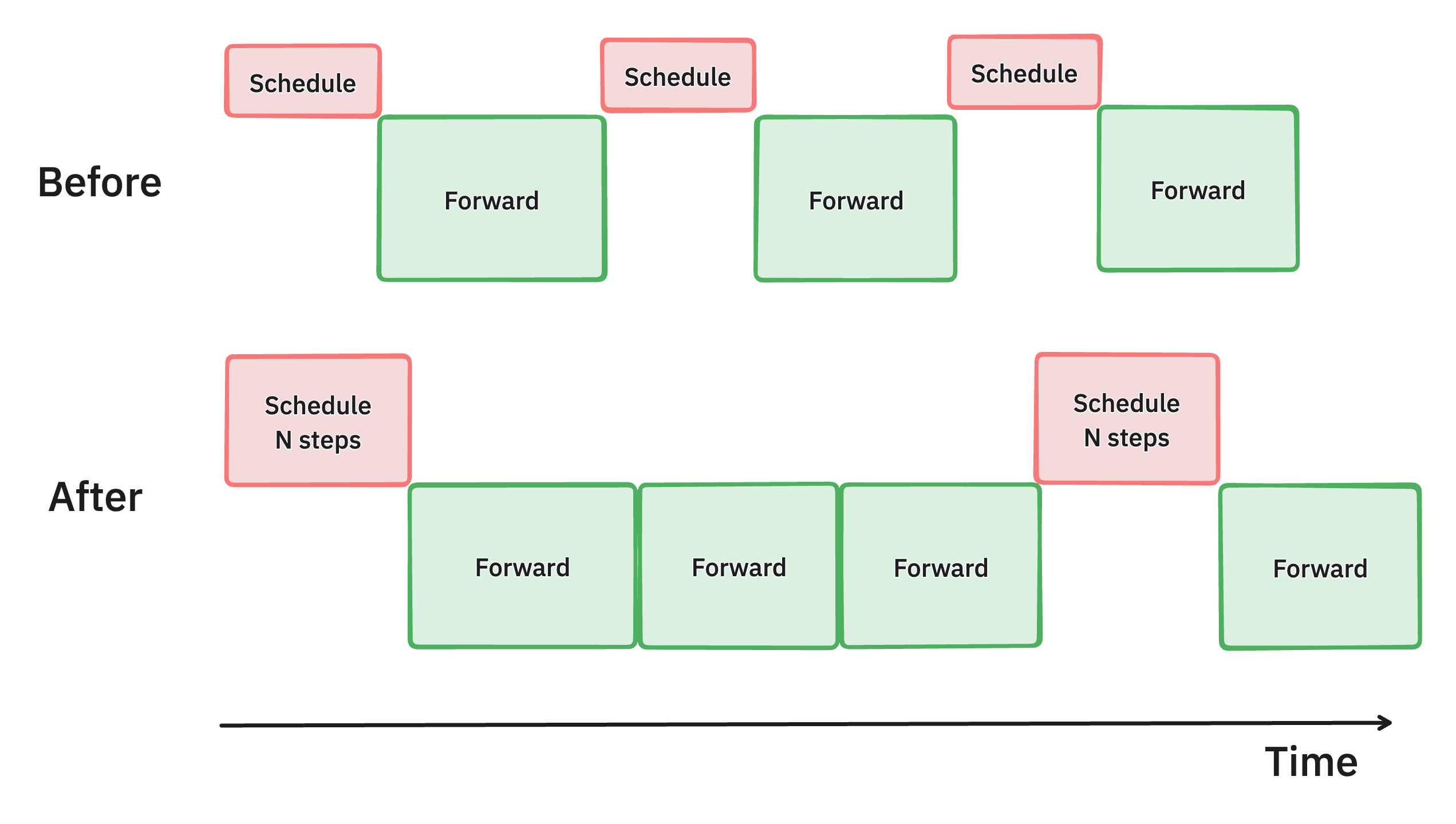 Illustration of the multistep scheduling method in vLLM. By batching multiple scheduling steps at once, we keep the GPU busier than before, therefore reducing latency and improve throughput.